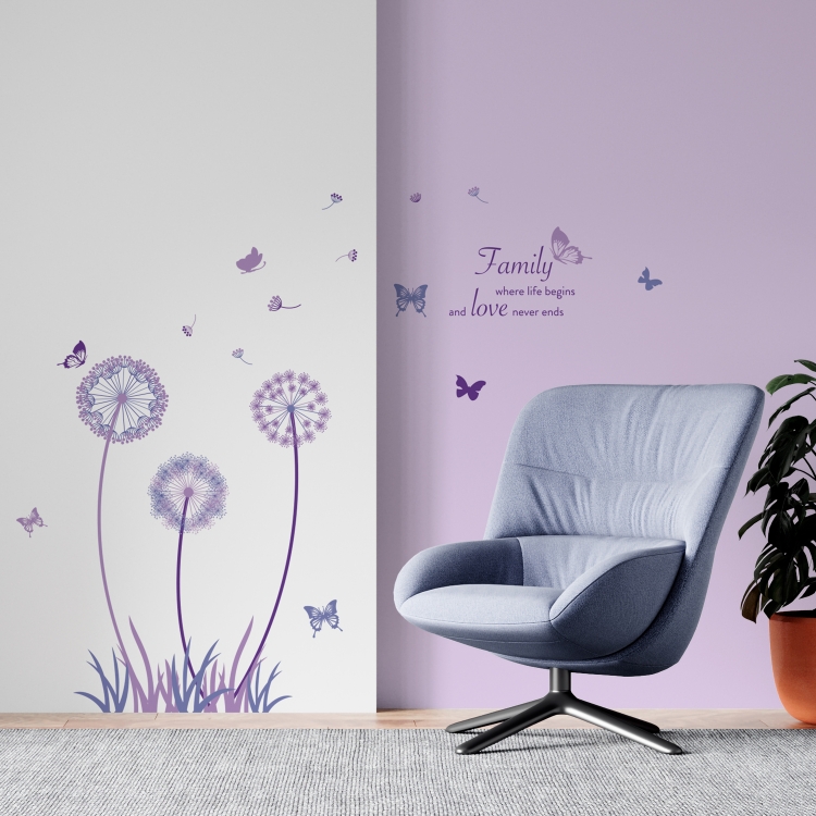 Motiv Vijolični regrat II - čudovita nalepka vijoličnega regrata v kombinaciji s citatom o družini, je idealna za popestritev vaše dnevne sobe!